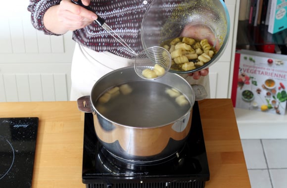 Versez les gnocchis petit à petit et dès qu’ils remontent à la surface, c’est qu’ils sont cuits.
