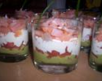 Mettre le tartare de tomates et poivrons dans le fond, ensuite la mousse d'avocat et des crevettes au-dessus.