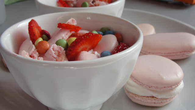 Décorer avec des morceaux de fraises, des coques de macaron rose en morceaux, des smarties.