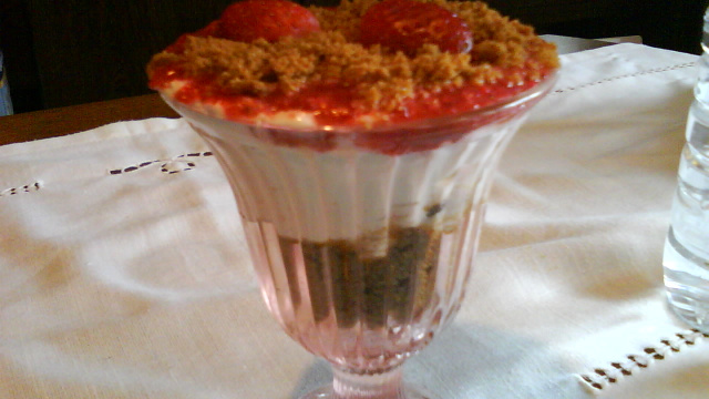 Recouvrez avec le reste des spéculos puis terminez par 1/2 fraise. Mettez au frais avant de servir.