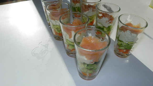 Dans 4 verrines, répartissez 3 c à s de surimi rapé. Réduisez en purée votre avocat avec un demi jus de citron puis en mettre une couche dans les verrines.