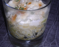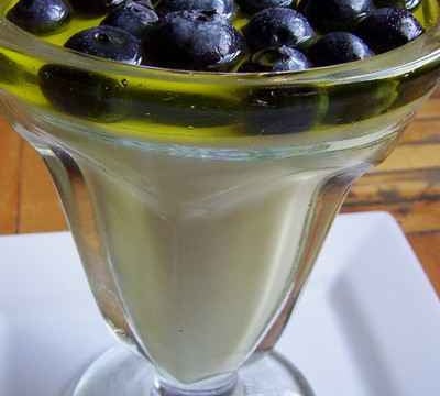 On prépare le reste de la gelée (au citron pour moi) 25 g avec 160 ml d'eau bouillante.On laisse refroidir et on verse sur la préparation au fromage.On oublie pas de mettre les bleuets dans la verrine avant de recouvrir avec la gelée au citron.