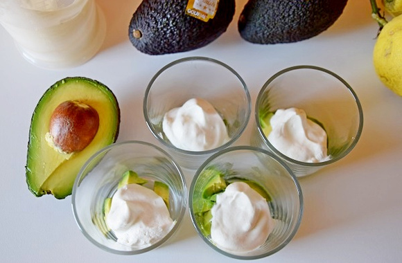 1Dans un bol, battre en chantilly la crème fraîche avec le mascarpone, sel et poivre. Réserver. Couper l'avocat en 2, ôter le noyau et couper la chair en dés avant d'évider le premier demi avocat et de répartir les dés dans le fond de 4 verrines. Ajouter un filet de citron.