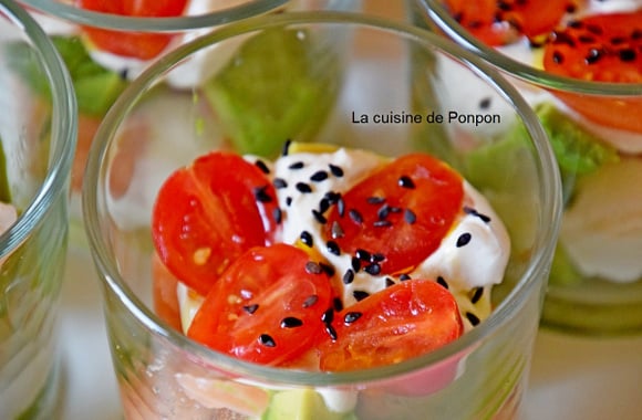 3Terminer par 2 tomates cerise coupées en 2 et parsemer de graines de sésame. Réserver jusqu'au moment de servir ou déguster de suite. Ajouter un petit filet d'huile d'avocat !