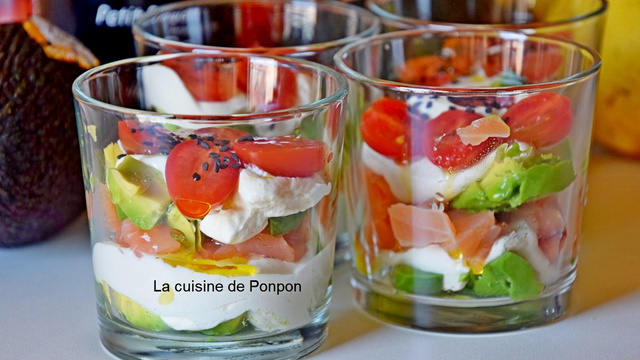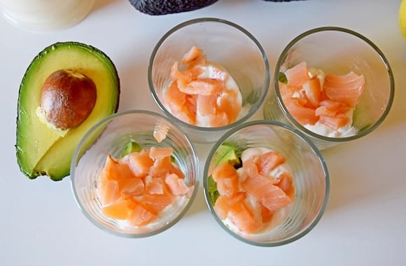 2Dans chaque verrine, ajouter 1cs de chantilly et recouvrir d'une tranche de saumon fumé émincée. Continuer avec une couche de dés d'avocat de la 2° moitié du fruit, un peu de jus de citron et couvrir d'1cs de chantilly.