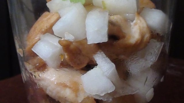Verrine avec un chutney de poires chaud avec des morceaux de poulets caramélisés avec une brunoise de poire crue.