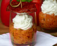 Quand votre préparation chorizo-poivron est cuite, mixez-la avec la crème liquide et laissez refroidir. Disposez alors le mélange dans des verrines. Recouvrez la mousse poivron-chorizo avec du chèvre à tartiner après l'avoir mis dans une poche à douille avec une douille cannelée.