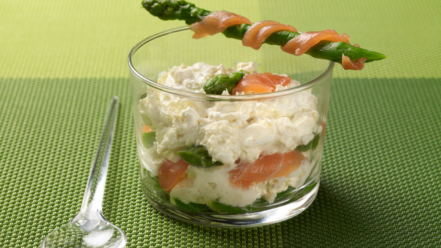Déposez un fond d'asperges dans les verrines, ajoutez une couche de fromage fouetté crabe asperges, placez quelques morceaux de saumon. Couvrez de nouveau d'une couche de fromage.