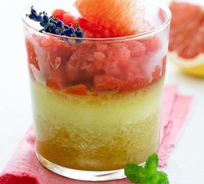 - Lavez, équeutez et mixez les fraises. Pressez le pamplemousse de Floride. Réalisez un sirop en faisant chauffer l'eau, le sucre le jus de pamplemousse et le jus de fraise dans une casserole. Laissez bouillir à petit feu pendant 5 min puis filtrez. Mettez ce sirop dans un plat large et placez au congélateur pendant au moins 2 heures. Grattez régulièrement la préparation à l'aide d'une fourchette pour faire des paillettes.Préchauffez le four à 180°C. Mélangez la poudre d'amande, les œufs, le sucre et le beurre ramolli. Disposez la préparation dans 4 verrines résistantes au four et cuisez pendant 20 min.Pelez les pamplemousses à vif et prélevez les suprêmes (quartiers sans peau).
