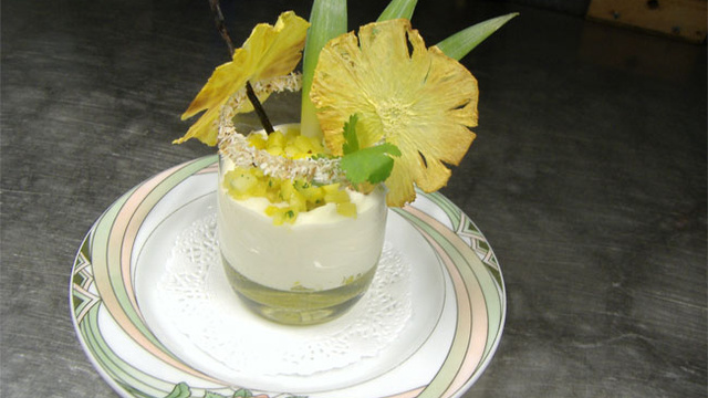 Garnir avec les petits dés d'ananas à la vanille puis un peu de spuma coco. Pour la décoration, déposez vos chips d'Ananas, la gousse de vanille séchée puis les plumets d'ananas.