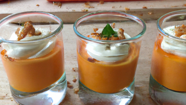 Décorez vos verrines de chips de carottes : pelez une carotte, puis coupez-la en fines lanières avec une mandoline ou simplement un couteau économe. Faites-la frire 1 à 2 min dans 2 cm d'huile de tournesol chauffée à 160 °C. Apongez-les sur du papier absorbant, puis déposez-les sur les verrines. Ajoutez enfin des brins de romarin.