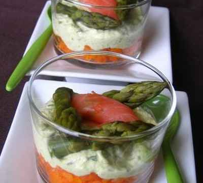 - Nettoyez et lavez les carottes, coupez-les en fine brumoise, et faîtes les cuire 5/6 minutes dans un bouillon de poule, aromatisé au cumin. Salez et poivrez. Égouttez et réservez au frais.Pendant ce temps, pelez les asperges, coupez les queues en tronçons et gardez les têtes intactes. Plongez le tout, dans de l'eau chaude salée, pendant 5/6 minutes. Égouttez, après les avoir passées sous un filet d'eau froide.Mixez les queues d'asperges en tronçon, avec le fromage ail et fines herbes, la crème fraîche, l'aneth, le sel et le poivre.Dans des verrines, disposez, deux cuillères à soupe de carottes au cumin, deux cuillères à soupe de préparation aux asperges, posez une tranche de saumon fumé par dessus, avec les têtes d'asperges réservées.Passez une bonne heure au frais avant de servir.