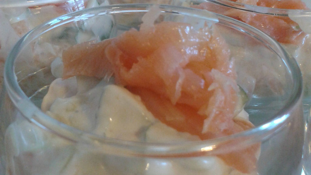 Pour dresser, mettre du concombre et saumon au gingembre dans la verrine et terminer par les lamelles de saumon.