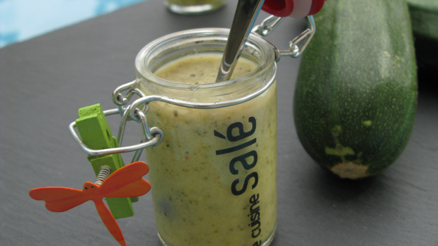 Mixez la fondue de courgettes et le concombre. Ajoutez la féta. Mixez de nouveau. Si votre préparation est trop compacte, détendez-la avec le lait que vous incorporez au fur et à mesure.