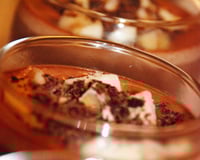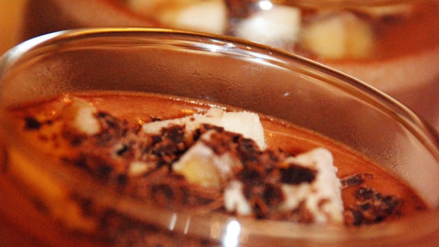 Pour la déco, j'ai fait des copeaux de chocolat noir avec un économe et j'ai taillé une banane en cubes, je l'ai mise au congélo pendant 45 minutes (pas plus sinon c'est trop dur et inmangeable) et je l'ai ajoutée au dernier moment sur la verrine, juste avant de servir.