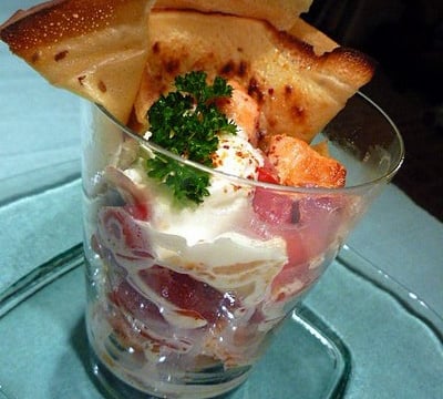 -Pendant ce temps, couper le saumon en cubes et le faire cuire rapidement dans une sauteuse avec de l'huile d'olive, le jambon coupé en petits morceaux et le piment d'Espelette. Poivrer et saler éventuellement après avoir goûté (le jambon est déjà très salé).