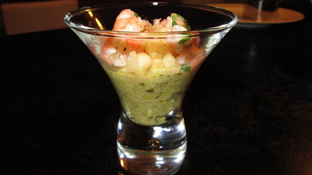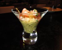 Décortiquez les crevettes les coupez en trois,déposez dans un saladier avec l'ail écrasé, la coriandre ciselé, le jus de citron, salez poivez la 1/2 pomme en petits dés, couvrir et refrigérez pendant 20min.