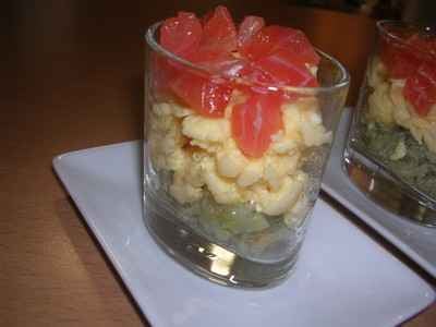 Du fenouil cuit à la vapeur, des oeufs brouillés, le tout décoré de dés de saumon fumé.