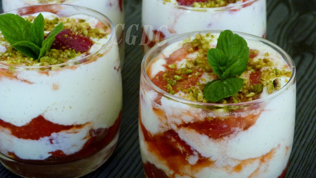 Incorporer les blancs d’œuf montés en neige Déposer de la crème au mascarpone au fond de la verrine, puis mettre des morceaux de fraises et recouvrir de crème. Mettre au réfrigérateur minimum 4 h.