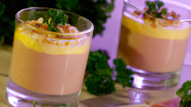 Décorer chaque verrine avec quelques lamelles de jambon cru et ajouter des feuilles de basilic, des noisettes ou des graines de sésame...