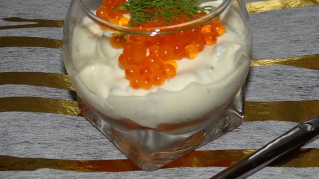 Disposer le mélange de crème sur le saumon, puis une cuillère à café d'oeufs de saumon et un brin d'aneth. Mettre au moins 1 heure au frais avant de servir.