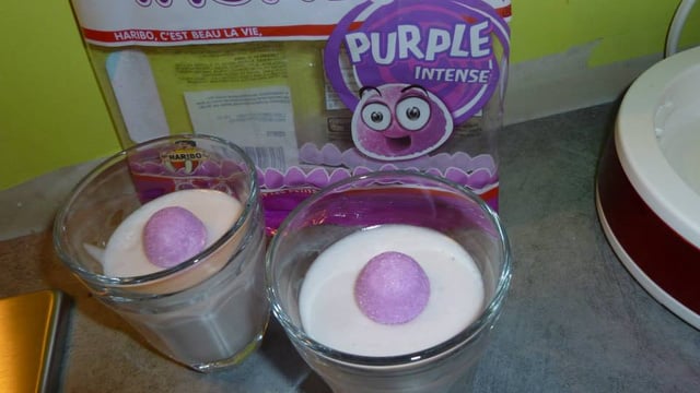 Monter au batteur la crème fleurette. Une fois la crème montée mettre le mélange au bonbons et lait. Avec une spatule et en décoration mettre un petit bonbon au milieu.