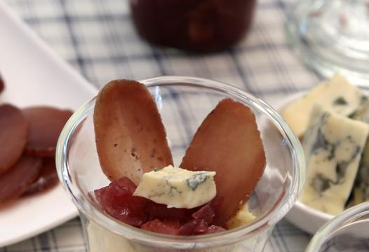 Couper le porc séché en petites tranches fines. Sur la polenta déposer une cuillère de chutney et une ou deux tranches de porc séché. Ajouter un dés de fourme d'Ambert et servir.