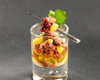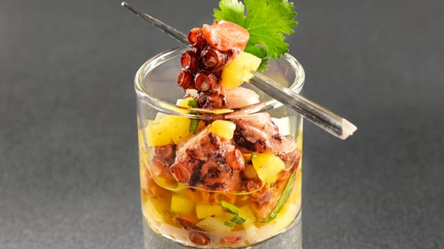 Mélanger dans un récipient creux, la mangue, la carotte et le céleri nettoyés et découpés en petits dés, la coriandre ciselée finement, le jus de citron, l'huile, le sel et le poivre. Ajouter le poulpe, filmer et réserver au frais.