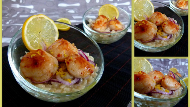 Disposez le risotto dans les verrines, placez vos noix de St Jacques par dessus et saupoudrez d'un peu de poivre. Servez immédiatement !
