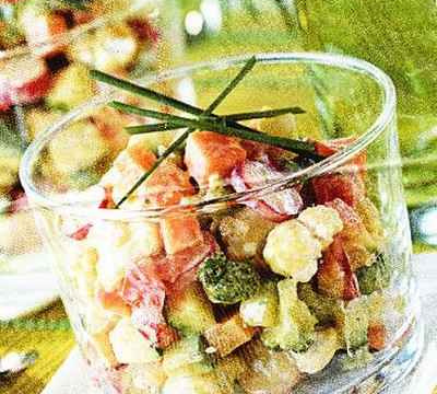 Pelez les carotes.lavez tous les légumes.Découpez tout les légumes en tout petits morceaux. Mélanger ensuite tous les ingrédiens de l'assaisonnement.Versez sur les légumes. remuez. placez la préparation au refrigérateur 15 min avant de servir.