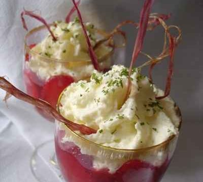 Compotée de rhubarbe vanillée, dés de fraises et coulis, crème légère à la verveine. Bonbons de rhubarbe.