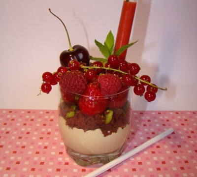 Le coulisEqueutez les fraises, puis mettez-les dans un blender. Mixez jusqu'à l'obtention d'un coulis, puis mélangez-y les graines de la gousse de vanille fendue et grattée. Réservez au frais.DressageVersez le coulis dans quatre tubes à essais et plongez dans chacun une gousse de vanille. Commencez par répartir la crème de mascarpone citron vert au fond de quatre verres. Emiettez ensuite dessus un peu de brownie aux pistaches vertes. Enfoncez à ce moment dans le verre, un tube à essai contenant le coulis. Ajoutez les fruits rouges harmonieusement, en les alternant, et après avoir pris soin d'équeuter les fraises. Posez une grappe de groseille horizontalement. Décorez avec un peu de poudre de pistaches vertes, et une sommité de menthe fraiche. Servez bien frais !