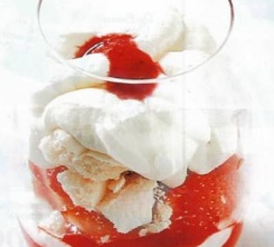 Une verrine avec une couche chantilly, meringue puis fraises.