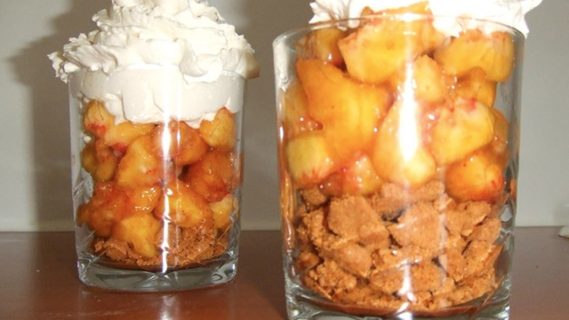 Disposer une couche de spéculoos hachés, une couche de salade de pêches, une couche de chantilly.