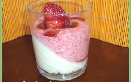 Donc pour en revenir à la verrine, j'ai fait un binôme mousse à la fraise et crème à la vanille, avec un coulis de fraise.