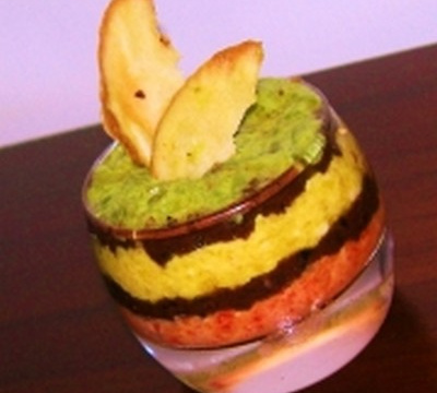 - Retirer la peau des poivrons, les mixer séparément avec pour chaque poivron le tiers du fromage de chèvre, du sel, du poivre et un peu d'huile d'olive. Réserver dans des coupes de même que la purée d'olives.