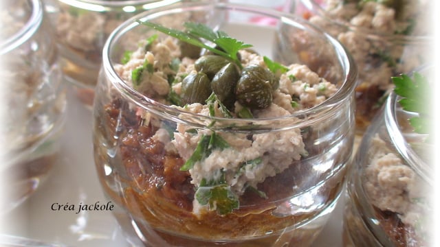 Monter la verrine avec au fond le mélange des 2 tomates et au dessus le thon à la mayonnaise