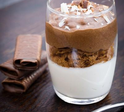 Sortir les verrines du réfrigérateur, disposer la mousse de chocolat noir sur la préparation au chocolat blanc - Laisser reposer au moins 1 h avant de servir. - 4