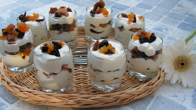 Dans le fond des verrines, mettre une couche de fromage, une couche de tomates séchées, une couche de fromage, une couche de fruits secs, et terminer par le reste de fromage. Décorer avec quelques morceaux de fruits secs.