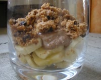 Répartir les dés de bananes dans les verrines. Ajouter une couche de Kinder® fondus. Enfin émietter un cookie dans chaque verrine.