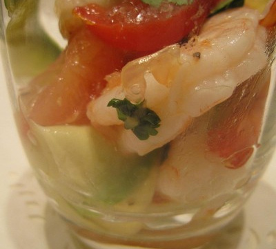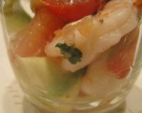 Répartir dans 4 verrines les lamelles d'avocat, les tomates les morceaux de pamplemousse et les crevettes. Parsemez de coriandre ciselée.