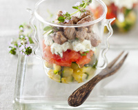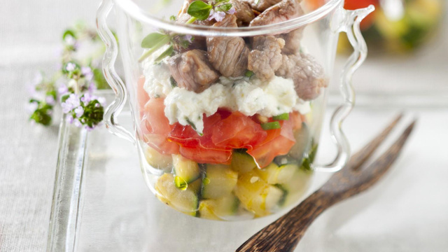Monter les verrines : une couche de courgettes tièdes, une couche de tomates, une couche de fromage de chèvre et finir avec l'agneau bien chaud.