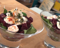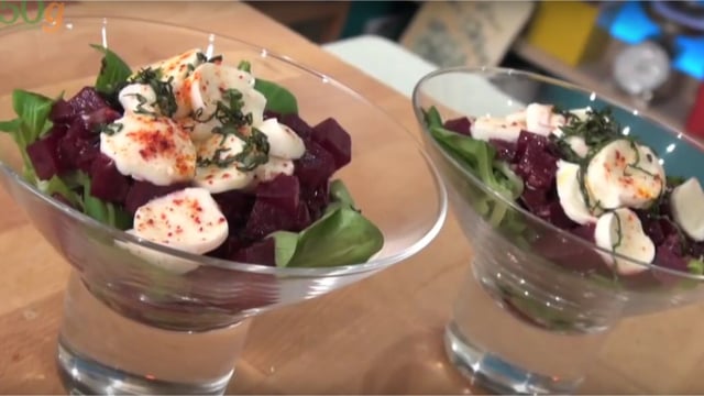 Dans une verrine, déposez un peu de mâche puis un peu de vos betteraves. Ajoutez les billes de mozzerrella coupée et le basilic.