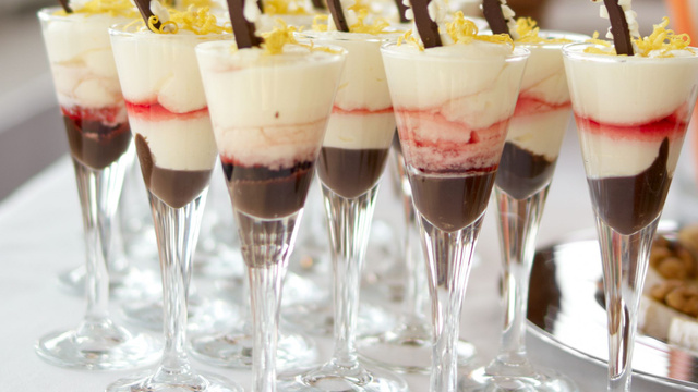 Des verrines disposées dans des flûtes pour le plaisir des yeux.
