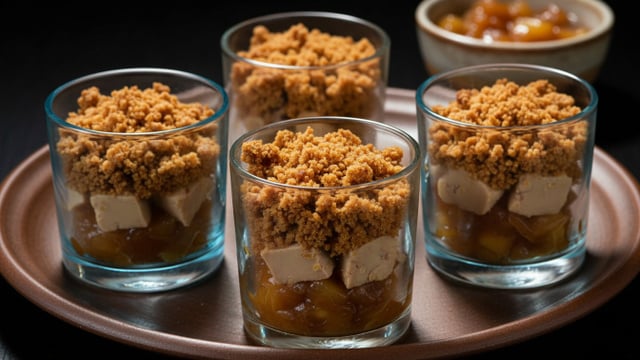 Pendant ce temps, préparez les verrines en mettant une grosse cuillère à soupe de pomme, du foie gras coupé en cubes et enfin saupoudrez de crumble de pain d'épices. Dégustez rapidement.