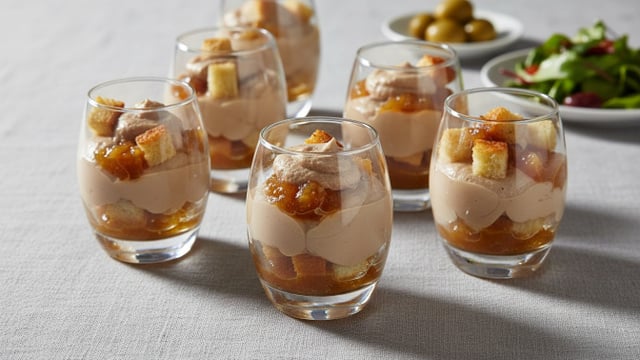 Ces verrines transforment le foie gras en une mousse légère à servir à l'apéritif ou en entrée. L'idée est de jouer sur l'alternance des couches entre la crème de foie gras, les confits de figues et d'oignons, et des miettes de pain croustillantes. C'est une option pratique pour les repas de fête puisqu'on peut préparer la base la veille pour gagner du temps le jour J. On peut facilement adapter la recette avec ce qu'on a sous la main, comme du pain d'épices ou du pain de seigle, pour varier les saveurs.