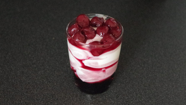 Alternez les couches de fromage blanc, de cerises puis rajoutez pour finir du sirop de griottes.