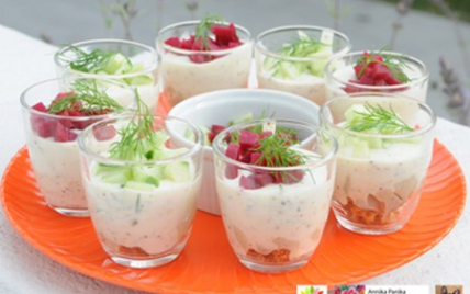 Au moment de servir, répartir les betterave ou les concombres dans les verrines ajouter quelques brins d'aneth lavés.