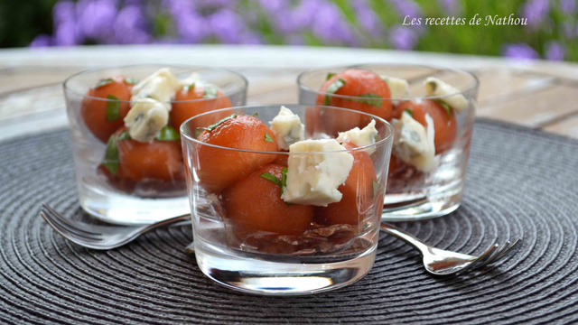 Au moment de servir, déposez des lanières de pancetta dans le fond des verrines, ajoutez les billes de melon marinées et quelques dés de gorgonzola...
