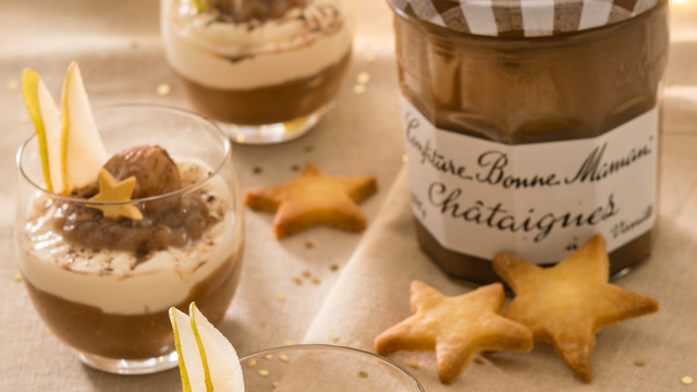 Puis ajouter une couche de Confiture de Châtaignes Bonne Maman, puis une couche du mélange Mascarpone-poires.
